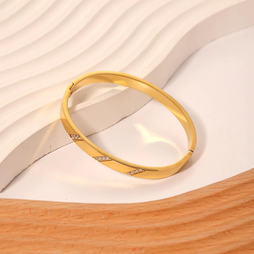 A stunning addition to your bangle stack! This gold stainless steel bracelet features an easy on/off clasp with simple CZ stone detailing, combining elegance and practicality. Water-resistant and tarnish-free, it’s perfect for everyday wear and special occasions alike.